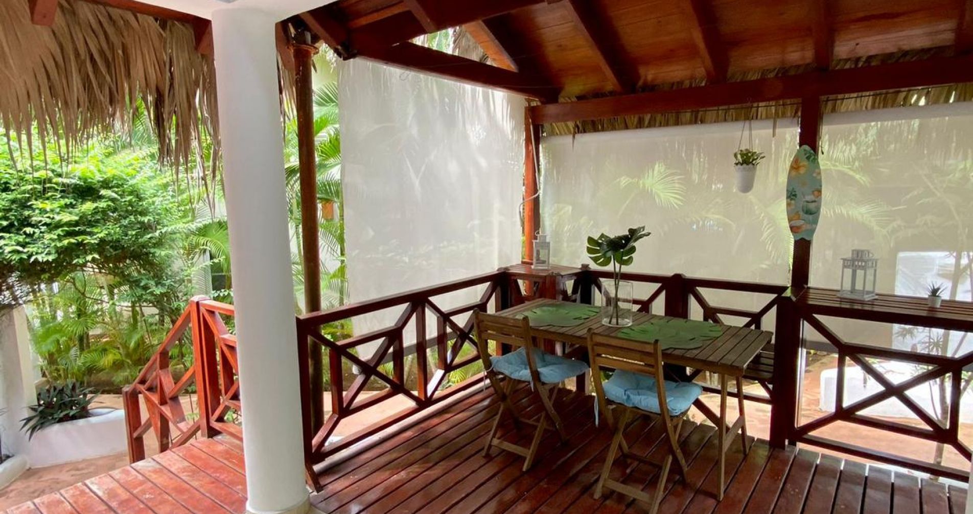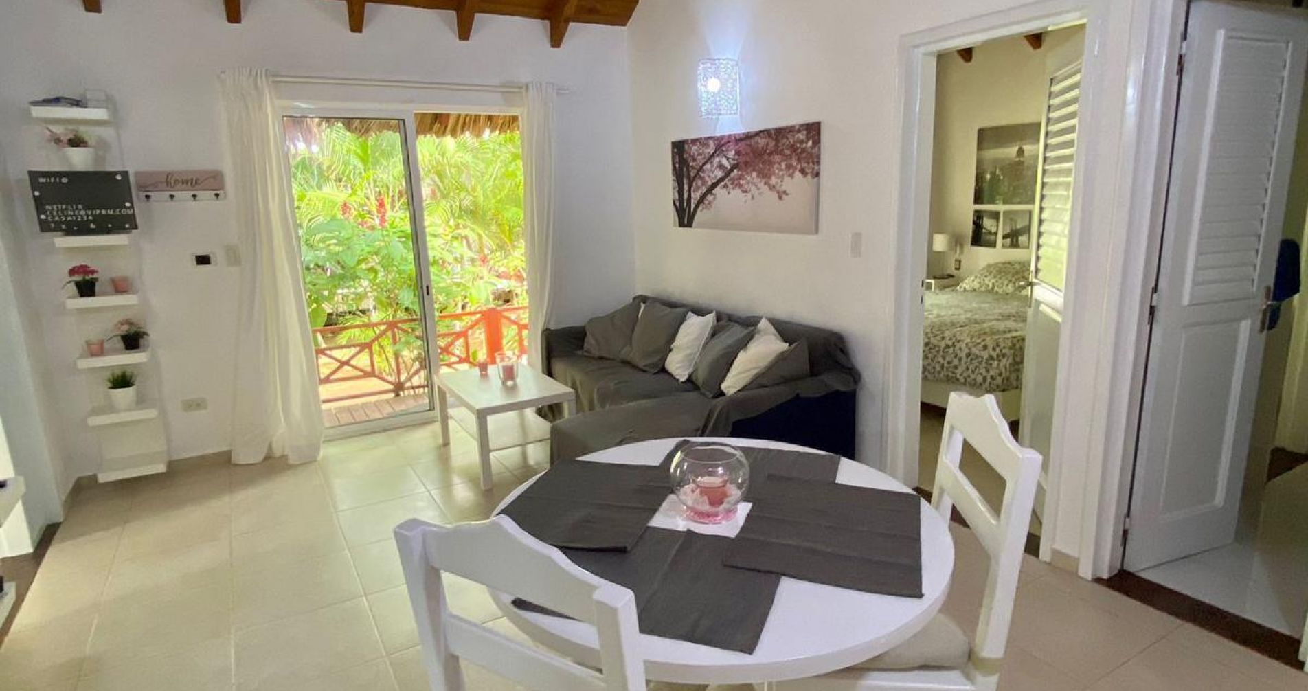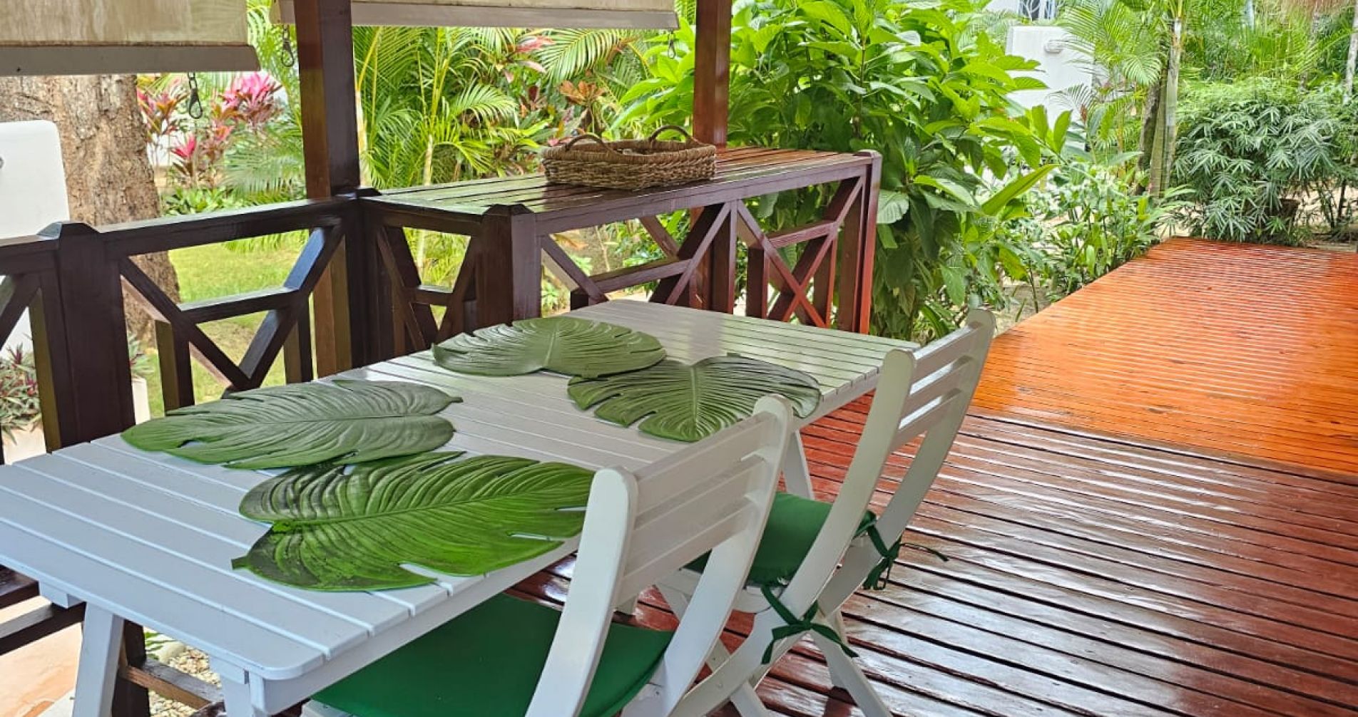 Chalet Tropical, 1 chambre + salon convertible, 1 sdb, 1 cuisine, 1 salon, grande terrasse, grande piscine commune, jardin tropical.